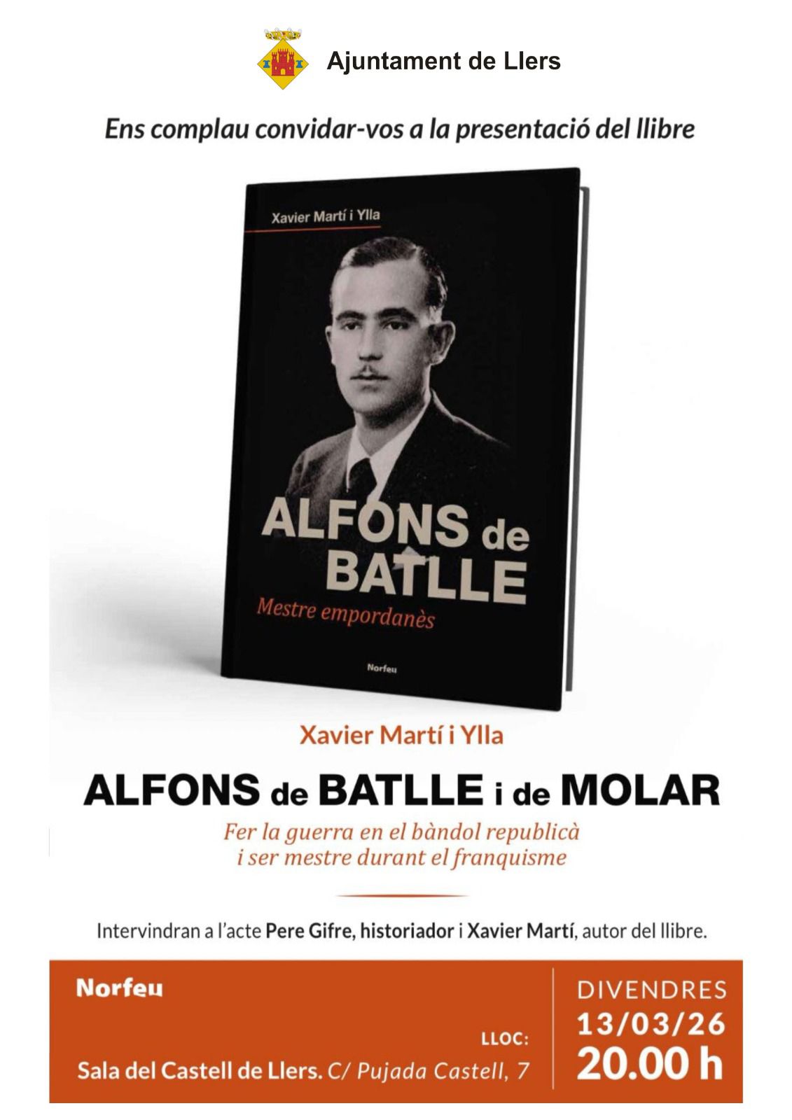 L’acte serà el proper divendres 13 de març de 2026 a les 20,00 h al Castell de Llers.